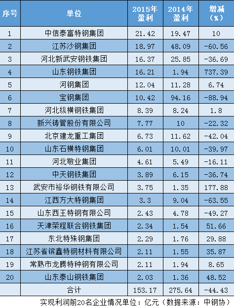 · 2015钢企业绩大PK中信泰富特钢集团夺得2015年钢企盈利冠军 中国品牌网 时间:2016-02-22 08:33 来源:本站 作者:翁崇琪 点击量:65次